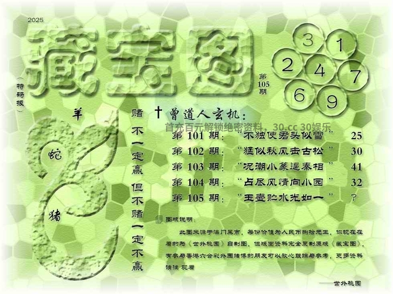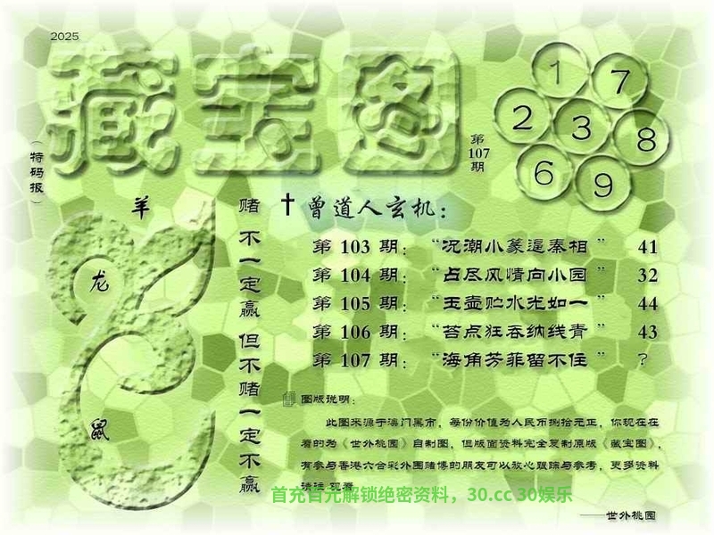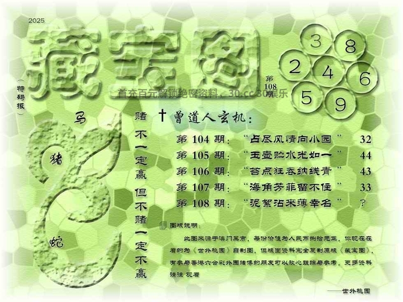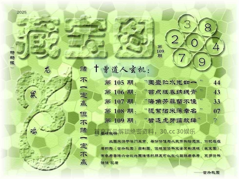 109期藏寶圖新:清坐闲披贝叶文 老:寻到溪源壹线初 禁:龙 禁:6尾 玄機字:《收》